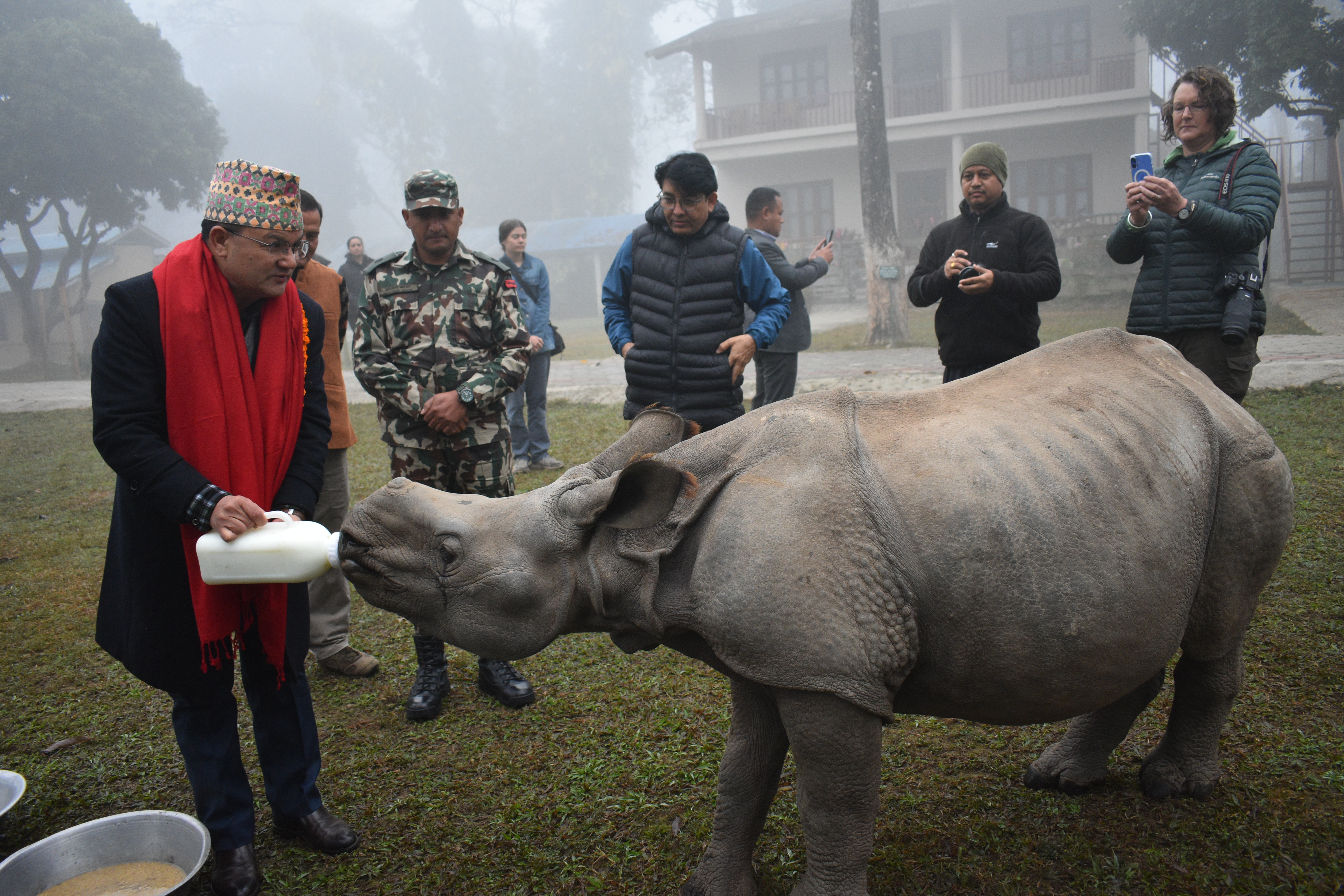 मा. वन तथा वातावरण मन्त्री ऐनबहादुर शाही ठकुरी चितवन सौराहा स्थित राष्टिय प्रकृति संरक्षण कोषको कार्यालय परिसरमा उद्धार गरि ल्याएका गैंडालाई दुध खुवाउदै ।